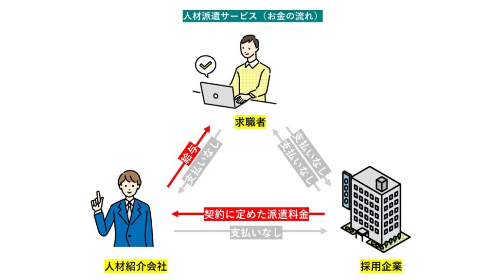 しかし、人材派遣の場合は、企業が派遣会社に対し「派遣されている期間に応じて契約に定めた派遣料金を支払う」というパターンがほとんどです。雇用元は人材派遣会社のため、求職者への給与などは派遣会社から支払われることとなります。お金の流れで言うと、企業→人材派遣会社→求職者となります。
