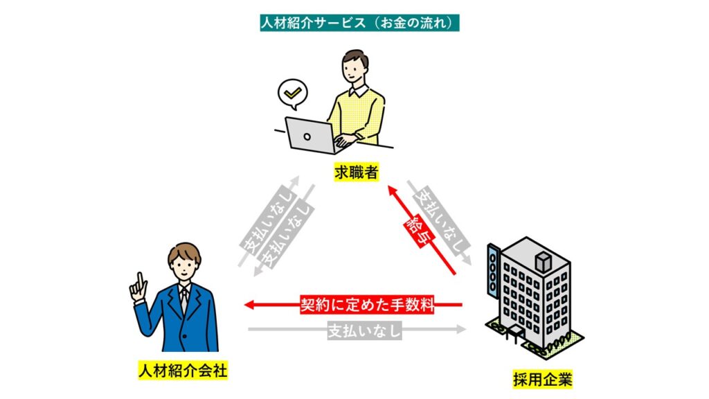 人材紹介のほとんどのサービスはこの「成果報酬型で一括支払いのみ」です。また、雇用元は採用企業となりますので給与なども当然採用企業から求職者へ支払われることとなります。