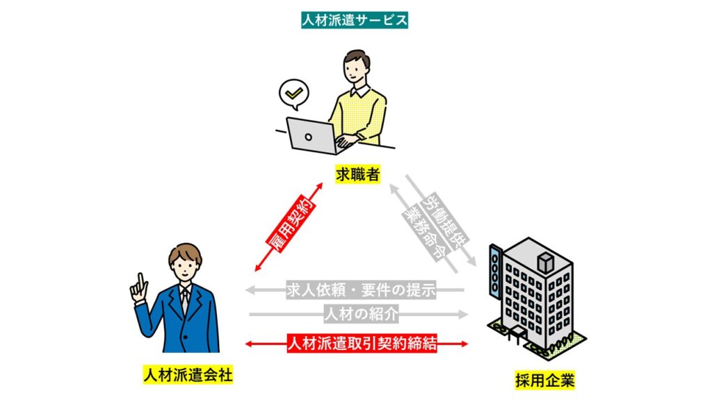 一方、人材派遣の雇用主は人材派遣会社となります。人材派遣会社と求職者が雇用契約を結び、求職者は派遣会社が契約している人手が欲しい企業で就業する、というサービスです。企業側からすると、一時的な人手不足の穴埋めのような形で利用するケースが多いでしょう。もちろん人材派遣会社の雇用のため、労務や給与管理なども人材紹介会社が行うことになりますので、派遣成立後の責任も基本的には雇用元の人材派遣会社側にあるということです。